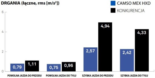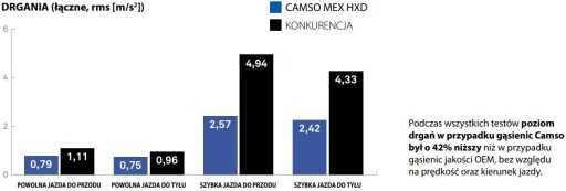 Podczas wszystkich testów poziom drgań w przypadku gąsienic Camso był o 42% niższy niż w przypadku gąsienic jakości OEM, bez względu na prędkość oraz kierunek jazdy.