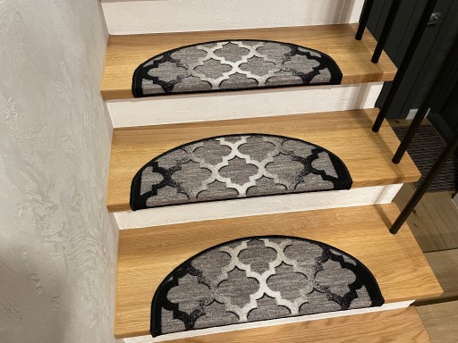Nakładki na schody, wykonane z najlepszego gatunku materiału. Wzmocnione brzegi, obszyte maszynowo. Prosty montaż dzięki warstwie samoprzylepnej specjalnej zbrojonej taśmy na spodzie oraz zastosowaniu kątownika profilowanego z PCV - takie rozwiązanie zapewnia mocne i pewne trzymanie się nakładki na schodach. Nakładki są bardzo proste w montażu. Wystarczy odkleić papierek od taśmy dwustronnej i przykleić do schodów.