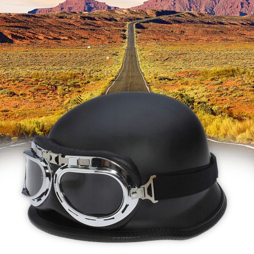 Kask motocyklowy w stylu retro, rozmiar L. Doskonały na skuter, motocykl, motorower i quada! Zestaw zawiera również stylowe gogle oraz dopinany daszek.