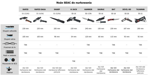 Poniżej porównanie noży z oferty SEAC, tak, aby łatwiej było wybrać model najbardziej odpowiedni do potrzeb. Wszystkie aktualnie dostępne warianty i modele można znaleźć wśród naszych ofert.
