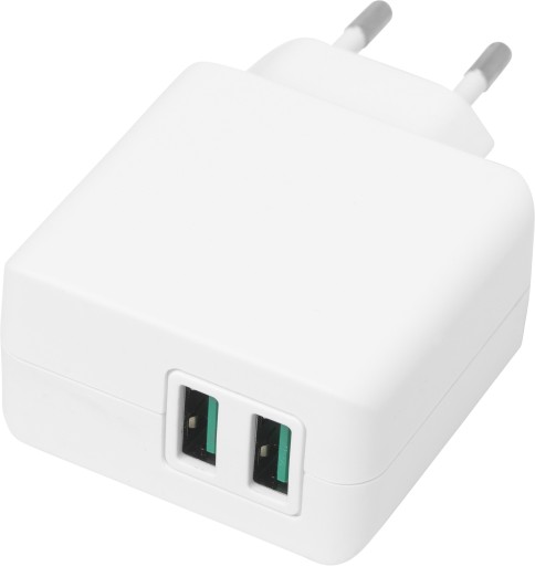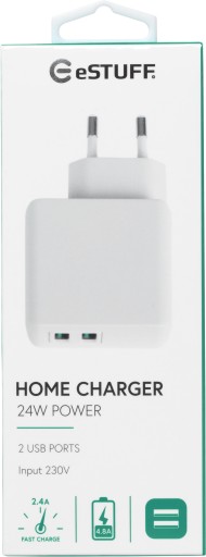 - Opis: eSTUFF Home Charger EU 24W 2 x USB-A Input: 230V EU plug. Output: 5V/2,4A+ 5V/2,4A. 24Watt. White