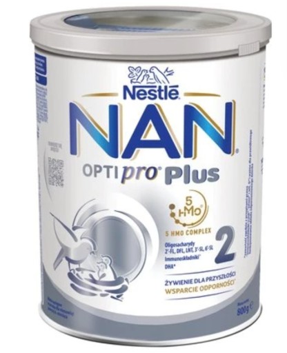 NAN OPTIPRO® Plus 2 HMO to mleko następne stworzone specjalnie z myślą o zdrowych niemowlętach powyżej 6. miesiąca życia, które z różnych przyczyn nie są karmione piersią. NAN OPTIPRO® Plus 2 HMO posiada unikalną recepturę, z kompleksem aż pięciu oligosacharydów (2’-FL, DFL, LNT, 3’-SL, 6’-SL), immunoskładników (cynk^, żelazo^, wit. D^) wspierających odporność dziecka, oraz DHA^, który wspomaga rozwój wzroku oraz mózgu maluszka.