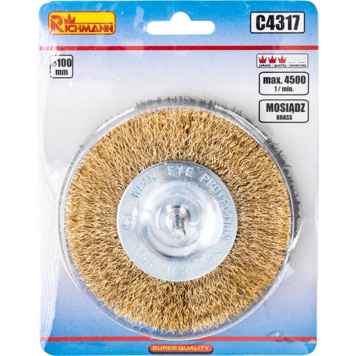 Szczotka druciana tarczowa o średnicy 100 mm do wiertarki.Przeznaczona do skutecznego i szybkiego oczyszczania przedmiotów z rdzy, farby, zadziorów oraz innych zanieczyszczeń.Włosie karbowane, wykonane z mosiądzu niepodatnego na wilgoć.Zastosowany materiał włosia gwarantuje trwałość jak również odporność na warunki atmosferyczne.Do pracy z wiertarkami oraz wkrętarkami o maksymalnej prędkości obrotowej 4 500 RPM.Odpowiedni kąt szczotki ułatwia pracę w trudno dostępnych miejscach.Może być stosowana zarówno na powierzchniach drewnianych jak i metalowych.Długość trzpienia wynosi 30 mm.