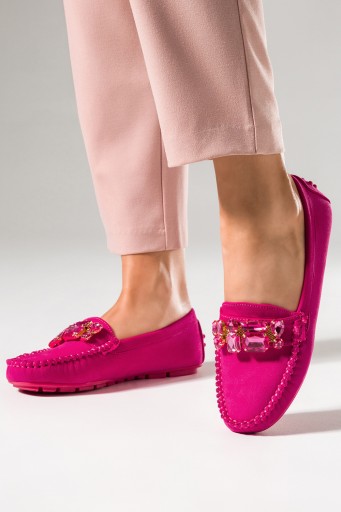 DAMSKIE MOKASYNY PÓŁBUTY PŁASKIE WSUWANE OZDOBNE KRYSZTAŁKI FUKSJOWE