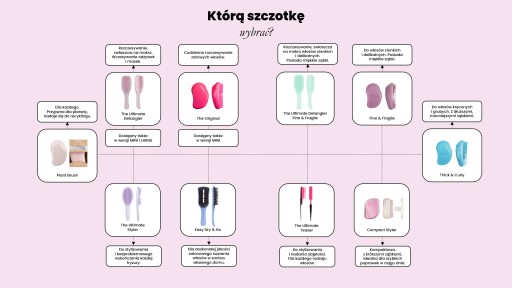 Tangle Teezer nie jest szczotką uniwersalną do każdego typu włosów. Elastyczne włókno w dwupoziomowych układzie ząbków i gęstym jego rozstawieniu pozwala na rozczesywanie włosów delikatnych i cienkich – w klasycznej wersji, modelu The Original, dostępnej także w wersji MINI. Nie jest on przeznaczony dla włosów słabych, bardzo cienkich, grubych, kręconych czy do masażu głowy. Do różnych typów włosów stworzyliśmy oddzielne rodzaje szczotek: