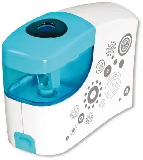 Automatyczna temperówka na baterie typu AA (4 sztuki, nie dołączone do opakowania) wyposażona w dwa wymienne mechanizmy ostrzenia z otworami różnej średnicy (11mm, 8mm). Posiada wyjmowany pojemnik na ścinki oraz antypoślizgowy spód. Możliwość użycia bez baterii.
