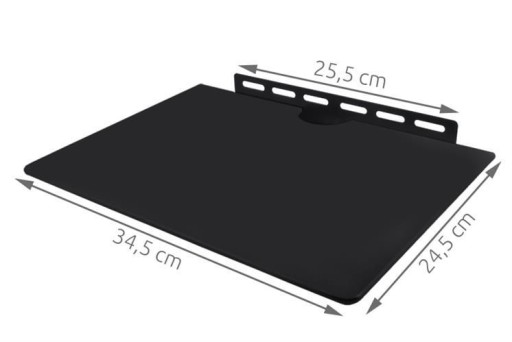 SPECYFIKACJA – maksymalne obciążenie półki: 10 kg, materiał: szkło hartowane + metal, wymiary (szer/dł): 34/24 cm, grubość szkła: 4 mm, waga: 1,5 kg, w zestawie: półka, stelaż, śruby montażowe.