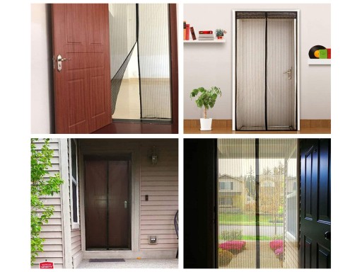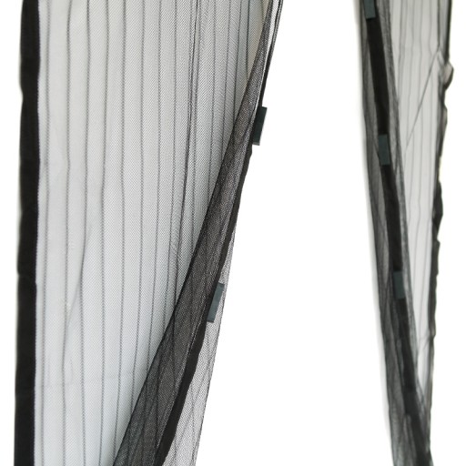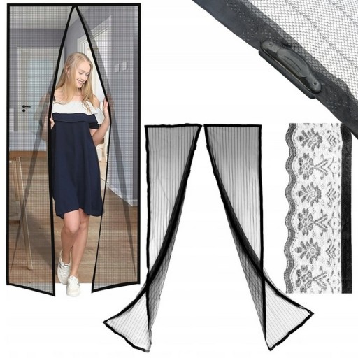 Moskitiera magnetyczna drzwiowa - dwa pasy. Zasłona składa się z dwóch pasów czarnej siatki z zamontowanymi w krawędziach pasami magnetycznymi (8sztuk kostek magnetycznych i 7 sztuk listew magnetycznych)- wychodząc przez zasłonę rozsuwamy pasy, które następnie po naszym przejściu "automatycznie" zasuwają się za nami zabezpieczając pomieszczenie. Pasuje do drzwi maksymalnie 140cm x 280cm.