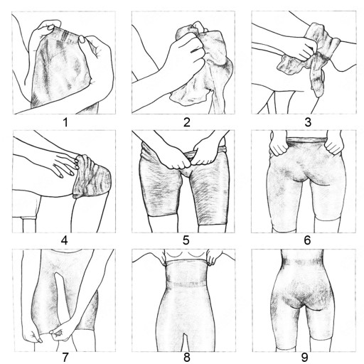 2) Tkanina płasko przylega do ciała w szybki i dyskretny sposób korygując (kształtując na nowo) figurę na odcinku od linii pod biustem, poprzez górne i dolne partie brzucha, talię, biodra, pośladki po uda.