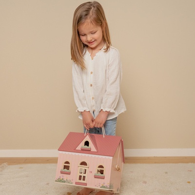 Domek dla lalek FSC (Little Dutch) Domek dla lalek FSC od Little Dutch to uroczy, starannie wykonany drewniany domek, który zachwyca swoimi detalami. Zaprojektowany z myślą o zabawie, składa się z salonu i kuchni na parterze, oraz sypialni i łazienki na piętrze. Dzięki wykorzystaniu drewnianego zamknięcia, otwieranie i zamykanie domku jest niezwykle proste, a przenośny uchwyt na dachu ułatwia jego transport. Mimo swojej kompaktowej budowy, domek doskonale sprawdzi się w każdym pokoju dziecięcym.