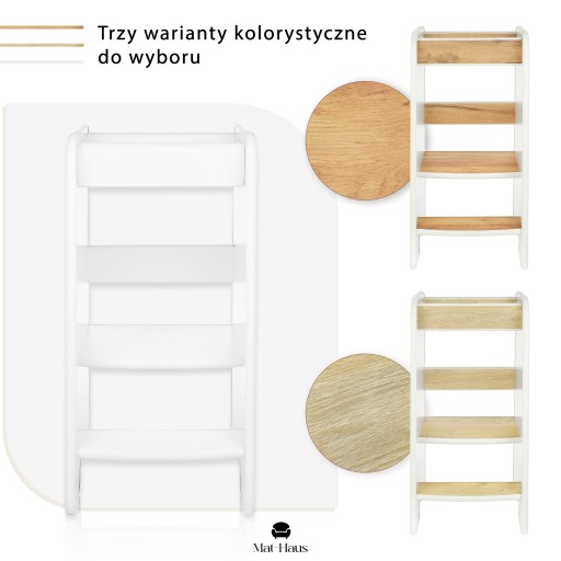 - Regulowana wysokość: Możliwość dostosowania stopnia na trzech różnych wysokościach: 23, 33 lub 43 cm, umożliwiając optymalne dopasowanie do potrzeb dziecka.