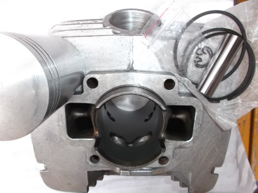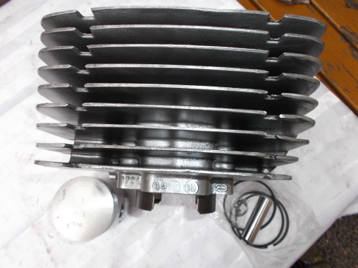 Zestaw: Cylinder, tłok, pierścienie, sworzeń, zabezpieczenia i uszczelki. Całość baz przebiegu. Cylinder po szlifie w renomowanym warsztacie szlifierskim. Luz pomiędzy tłokiem a gładzią cylindra to 5 setnych mm. Tak jak zeleca fabryka MZ. Na dodatkowe zamówienie mogę za dopłatą wykonać korektę lub porting kanałów w cylindrze- poprawiający osiągi motocykla.