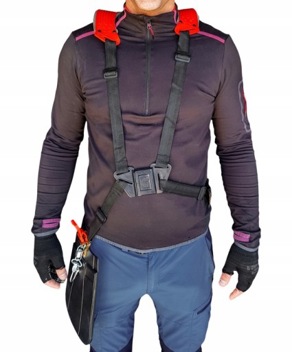 - Szelki zostały wyposażone w zatrzask do awaryjnego odpięcia kosy za pomocą jednej ręki.