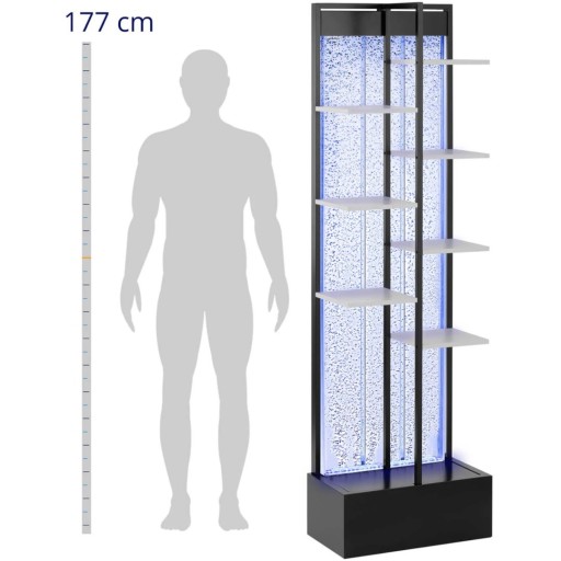 Ścianka wodnej bąbelkowa z półkami marki Uniprodo pozwala stworzyć niezwykłą atmosferę. Można ją ustawić jako element przyciągający wzrok w domu, biurze, salonie fryzjerskim, czy w strefie gastronomicznej jako część baru lub restauracji. Stylowa i funkcjonalna ścianka posiada 7 stałych półek wykonanych z płyty pilśniowej o grubości 18 mm, na których można postawić kwiaty, butelki i inne dekoracje w odpowiednim świetle. Podświetlana ściana bąbelkowa ma 51 diod LED, które oświetlają półkę w spektrum kolorów RGB. Za pomocą pilota można ustawić pożądaną barwę i rytm jej zmiany. Pilot ma zasięg 3m. Przezroczysta akrylowa osłona sprawia, że ściana wodna bąbelkowa jest lekka i pozwala podziwiać wędrujące pęcherzyki powietrza. Stalowa rama, podstawa i pokrywa ścianki wodnej kontrastują z czernią i tworzą ładną całość. Ściana wodna LED jest ze wszystkich stron zabezpieczona przed rozpryskującą się wodą w stopniu ochrony IPX4. Elementy sterujące są bezpiecznie ukryte w stabilnej podstawie.