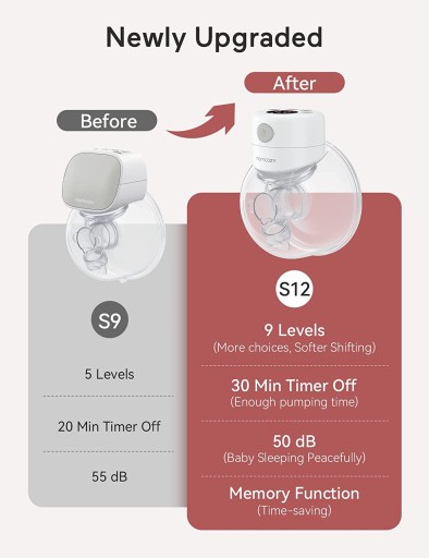 Dodano technologię wizualną: laktator Momcozy został udoskonalony poprzez dodanie wyświetlacza LCD, dzięki któremu działanie i moc elektrycznego laktatora są widoczne; Laktator waży również bez opakowania tylko 222 g, co odpowiada wadze 4 jajek, co ułatwia matkom noszenie go.
