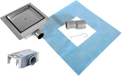 odpływ stalowy, maskownica o grubości 1,5mm, syfon wraz z koszyczkiem i odejściem, nóżki poziomowane do prawidłowego ustawienia odpływu, mata wodoszczelna niezbędna do prawidłowego montażu, instrukcja montażowa w języku polskim.