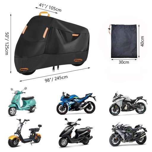 Ten pokrowiec na motocykl ma wymiary 220 x 95 x 125 cm i jest odpowiedni dla większości motocykli, takich jak Harley-Davidson, Honda, Yamaha, Kawasaki, Suzuki itp. Przed zakupem należy zmierzyć motocykl, aby upewnić się, że wymiary są prawidłowe.