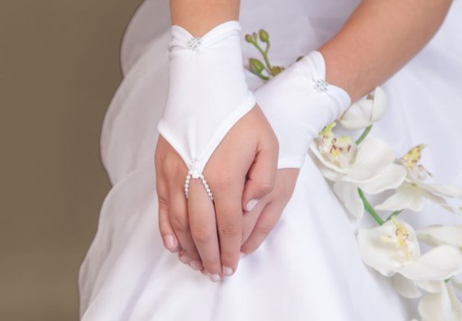 Rękawiczki na Pierwszą Komunię Świętą - bez palców Rękawiczki dla dziewczynki na Pierwszą Komunię Świętą to wyjątkowy element jej uroczystej garderoby. Charakteryzują się one nietypowym designem, pozbawionym palców, co nadaje im lekkości i elegancji. Rękawiczki z uchwytem na palec Rękawiczki utrzymują się stabilnie na dłoni dzięki wyjątkowemu rozwiązaniu - koralikom nakładanym na palec środkowy, które zapewniają pewne i wygodne trzymanie. Eleganckie zdobienie Nadgarstek ozdobiony jest subtelnie marszczonym detalem, który dodaje im delikatności i kobiecego uroku. Ozdobą rękawiczek jest również kwiatuszek wykonany z drobnych cyrkonii, który umieszczony jest w tym miejscu. Dzięki temu detalowi rękawiczki zyskują wyjątkowy blask i subtelny błysk, przyciągając uwagę i nadając dziewczynce wyjątkowy wygląd w tym szczególnym dniu. Te rękawiczki nie tylko pełnią funkcję ozdobną, ale także praktyczną, zapewniając dziewczynce wygodę i elegancję podczas uroczystości Pierwszej Komunii Świętej. Rozmiar uniwersalny. Długość całkowita: 16,5 cm.