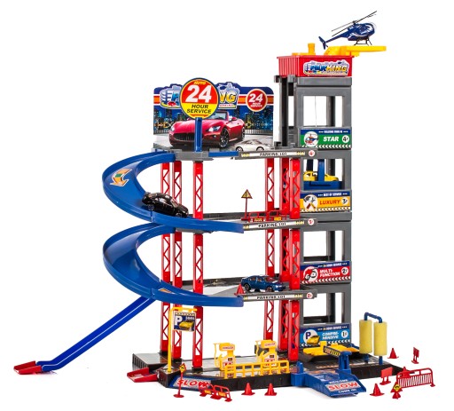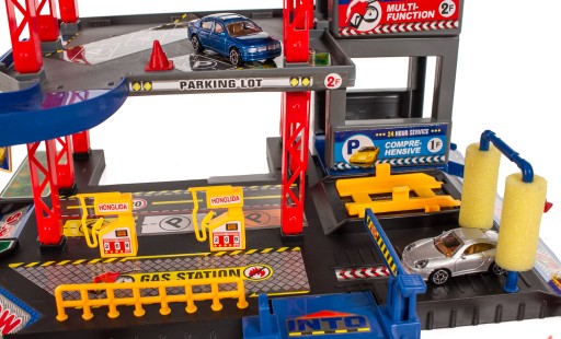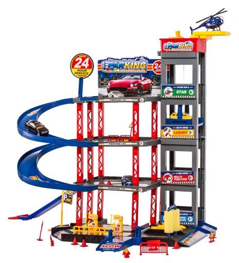 Wspaniała zabawka, która dostarczy wielu godzin fascynującej zabawy. 3-pietrowy parking z ruchomą windą, którą auta mogą przemieszczać się między piętrami. Aby wjechać na parking trzeba podnieść rampę.
