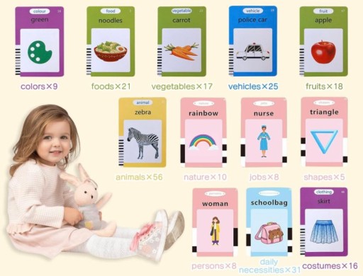 ✅Nasz czytnik kart do nauki angielskiego zawiera aż 112 kart, na których znajdują się 224 słówka w języku angielskim.