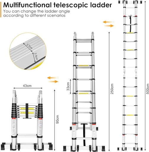 Nasza aluminiowa drabina teleskopowa może być używana jako rama A 2,5 m + 2,5 m, może być również rozbudowana do prostych przewodów przedłużających o długości 5 m. Dzięki stabilnemu mechanizmowi blokującemu drabina jest stabilna, nie chwieje się i nie ma krzywizn.