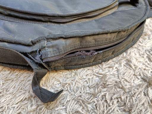 Pokrowiec posiada uszkodzony zamek w dużej komorze oraz sporo zewnętrznych zabrudzeń, zamki w mniejszej komorze oraz w wbudowanym pokrowcu na pałki sprawne. W pokrowcu wciąż można bez problemu przechowywać i transportować talerze oraz pałki, jednak bez opcji zamknięcia dużej komory zamkiem, jedynie poprzez zapięcie rączki.