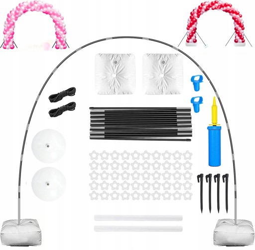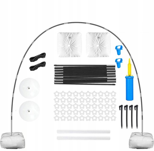 - 2 podstawy z PVC, 2 długie rury z PVC, 2 worki na wodę, 1 pompka do balonów, 50 klipsów do balonów, 2 węzły do balonów, 2 liny mocujące do podłogi, 4 kolce do uziemienia.