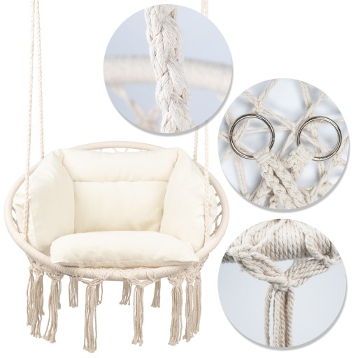 Fotel wiszący został stworzony z wykorzystaniem delikatnych makramowych plecionek, które emanują stylem boho i naturalnością. Wykorzystanie bawełnianych sznurków makramowych podkreśla nasze pragnienie bliskiego kontaktu z naturą oraz hołd dla prostoty rzemiosła. Dzięki swojemu bocianiemu kształtowi i unikalnej konstrukcji, nasz designerski mebel nie tylko oferuje wygodne miejsce do relaksu, ale również wtapia się w otoczenie, przyciągając wzrok swoją niepowtarzalną estetyką.
