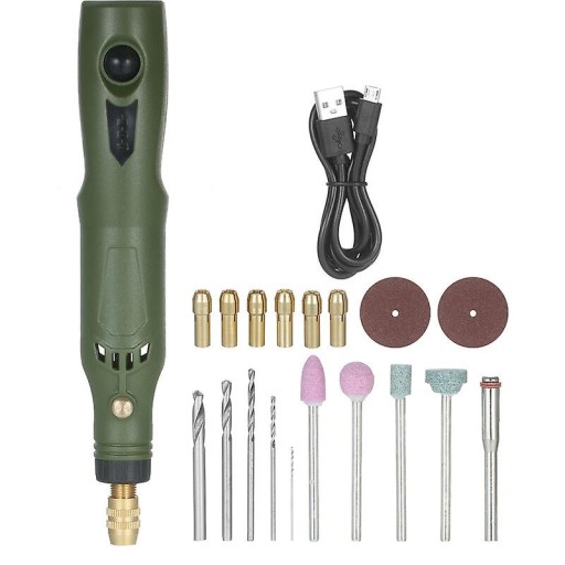 The rotary tool is small and powerful, featuring variable speed, up to 15000rpm running speed and multiple accessories, which helps carefully work on compact and fragile items.Features:MULTITOOL: Comes with various attachments enables the electric rotary tool to do the cutting, grinding, polishing, and drilling jobs.STRONG POWER: Maximum running at 15000 revolutions per minute, the mini grinder tool can handle ceramic, porcelain, plastic, metal, stone, modeling clay, walnut, wood and more smooth workpieces.ADJUSTBALE SPEED: 3 variable speed makes doing precision work so much easier.USB RECHARGEABLE: Built with Micro-USB port and rechargeable lithium battery for super convenient charging and cordless operation.FITS MOST SIZES: Includes 6 collets in the size of 0.5mm, 1.0mm, 1.5mm, 2.4mm, 3.0mm, and 3.2mm. You can install other attachment that fits the collet. POCKET SIZE: Small enough to be held in hand, which is compact and lightweight for easy one-handed operation.WIDE APPLICATION: Used for wood carving, jewelry making, crafting projects, DIY creations, and other small precise jobs. Specifications:Material: ABSColor: Green Rated Voltage: 3.7VRated Power Output: 20WNo-load Speed: 15000 rpmCharge Port: Micro USBBattery Type: Lithium BatteryBattery Capacity: 380mAhCharging Voltage: 5VItem Size: 15.5*3cm / 6.1*1.18inItem Weight: 97g / 3.42ozPackage Size: 21*8*6cm / 8.26*3.14*2.36inPackage Weight: 196g / 6.91ozPacking List1 * Rotary Tool1 * Attachment Kit(2*Cutting Wheel/6*Collet/5*Drill Bit/4*Grinding Stone Bit/1*Mandrel)1 * USB Cable1 * User Manual