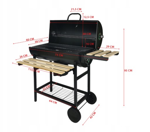 ✔️ Grill posiada dwie składane drewniane półki oraz jedną drucianą zamontowaną da dole.