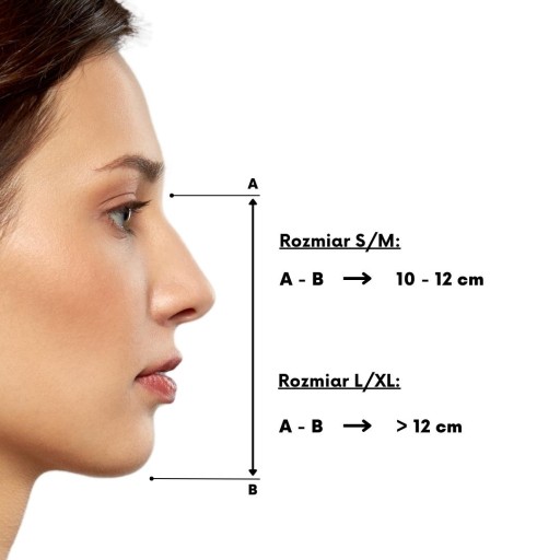 ➡️ Zalecamy pomiar twarzy, aby upewnić się, że maska będzie pasować. Należy zmierzyć odległości od brody do górnej części nosa – według instrukcji na zdjęciu.
