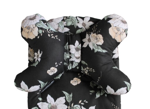 Wypełnienie - wkładka wypełniona owatą, o właściwościach antyalergicznych, nie chłonie wilgoci i jest przewiewna. Dzięki użyciu tego rodzaju wypełnienia wkładka jest mięciutka, można dopasować ją bez problemu do wózka i zapewnia komfort przy opieraniu się o nią. Motylek wypełniony antyalergiczną kulką silikonową.