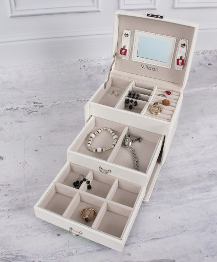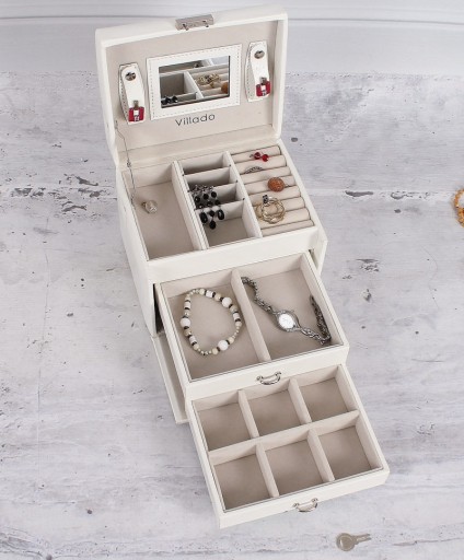 Minimalistyczny biały kuferek do biżuterii posiada wiele przydatnych przegródek: