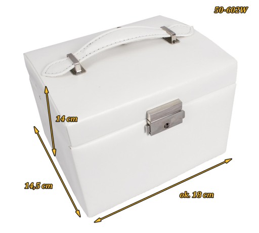 Praktyczny biały kuferek na biżuterię ze skóry ekologicznej. Posiada różne przegródki do przechowywania kolczyków, pierścionków, łańcuszków i innej biżuterii oraz ułatwia utrzymanie porządku. Od środka kuferek wyłożony jest jasnym welurem. Zamykany jest na kluczyk dołączony do kuferka oraz posiada rączkę do przenoszenia.