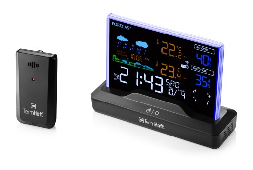 Bezprzewodowa stacja pogodowa TermHoff TH-WS2 z barometrem oraz dodatkowym czujnikiem: mierzy temperaturę wewnętrzną i zewnętrzną oraz przewiduje lokalną prognozę pogody, co czyni go idealnym wyborem do uzyskiwania dokładnych pomiarów dostępnych za jednym spojrzeniem na czytelnym wyświetlaczu.