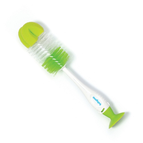 Szczotka z przyssawką „SAMOSTOJĄCA” pomaga w dokładnym czyszczeniu zarówno butelki, jak i smoczka. Szczotka posiada przyssawkę, która umożliwia przyczepienie jej do płaskich powierzchni, dla ułatwienia osychania. Szczotka do butelki jest zakończona miękką gąbką, która dostosowuje się do kształtu butelki. W uchwycie rączki jest schowana mała szczotka do czyszczenia smoczka. Miękkie włosie szczotek i gąbka docierają do trudno dostępnych miejsc. Szczotki wykonane są z trwałych i bezpiecznych materiałów, nie zawierających Bisfenolu A.
