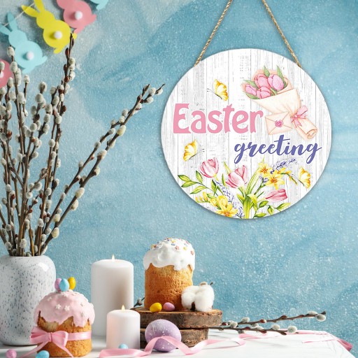 [Rozmiar]: Dzięki wymiarom 11,42 cala x 11,42 cala x 0,20 cala nasz wielkanocny znak wiszący idealnie pasuje do większości drzwi. To sposób na ciepłe powitanie członków i przyjaciół.