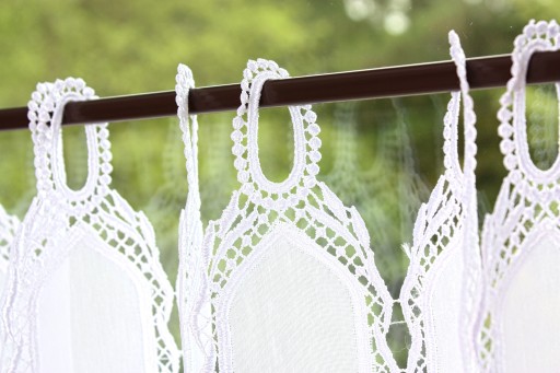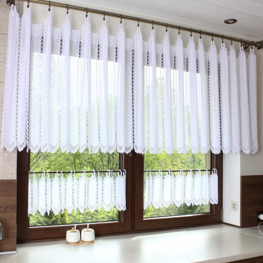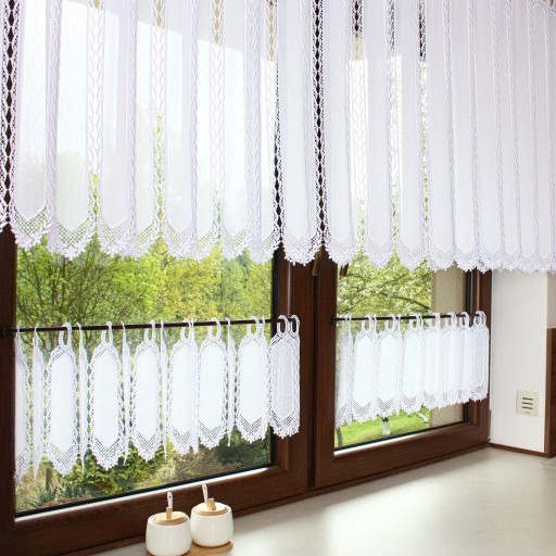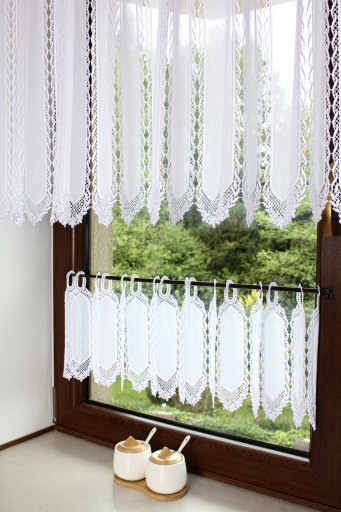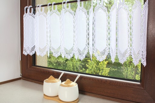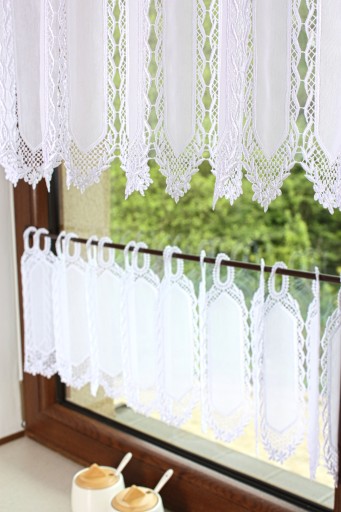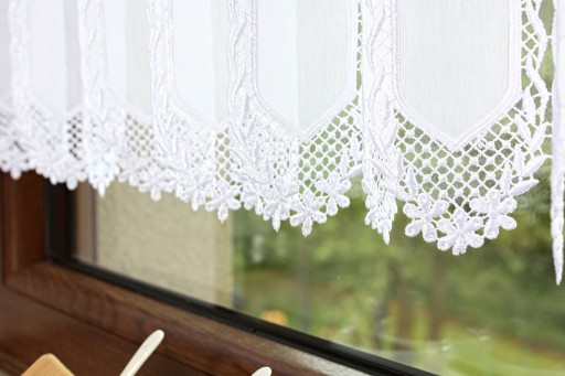 Przedmiotem sprzedaży jest firanka kuchenna typu zazdrostka o wysokości całkowitej 32 cm . Panele z tkaniny przypominającej etaminę są połączone przepięknymi aplikacjami gipiurowymi nadając niesamowitego wyglądu szykownej dekoracji okiennej . Firaneczka jest cięta z walka i nie wymaga obszywania , dodatkową zaletą jest fakt że można taką zazdrostkę powiesić również na żabkach karnisza aby pełniej ozdobić nasze okno