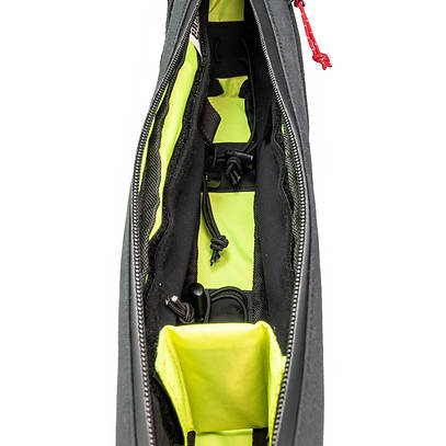 Wnętrze jest kontrastowe i jaskrawo jasne, dzięki czemu z łatwością znajdziemy w środku małe przedmioty a na spodzie znajdują się mocowania, które pozwolą zabezpieczyć wyposażenie przed lataniem torbie. Umocowanie części ekwipunku na stałe w bagażu sprawia że się nie miesza i łatwo jest szybko znaleźć to czego potrzebujemy. Np: powerbank, multitool, baterie czy klucze do domu. Na bocznych ściankach umieściliśmy zapinane na rzep kieszonki na drobniejsze przedmioty.