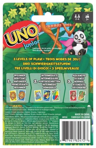 Ta wesoła, łatwa i kolorowa gra karciana jest odpowiednia dla dzieci już od 3 roku życia! Ma trzy poziomy zabawy, aby mogła towarzyszyć dzieciom przez długi czas. Oprócz cyferek od 0 do 8 na kartach są także obrazki uroczych zwierzątek, co ułatwia dopasowywanie najmłodszym. Trzy poziomy zabawy pozwalają grze rosnąć wraz z dzieckiem. Poziom 1 to proste dopasowywanie kolorami i zwierzątkami, poziom 2 wprowadza karty specjalne, a poziom 3 dodaje karty z karami. Gracze próbują jak najszybciej pozbyć się wszystkich swoich kart, dopasowując je do karty, która aktualnie znajduje się na górze stosu. Dopasowywać można kolorem i cyfrą lub zwierzątkiem. Przygotuj się na mnóstwo śmiechu! I nie zapomnij krzyknąć UNO!, gdy w ręku zostanie Ci tylko jedna karta.