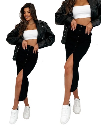 Klasyczna długa spódnica jeansowa z rozcieciem z przodu. Wykonana z elastycznego materiału, bardzo ładnie dopasowuje się do ciała. Długa spódnica jeansowa to klasyczny element garderoby, który wprowadza do stylizacji nutę casualowego uroku i wygody. Ta spódnica jest zarówno modne, jak i praktyczne rozwiązanie na wiele okazji.