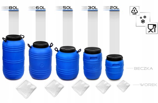 Beczki wykonane są z tworzywa sztucznego, dopuszczona do kontaktu z żywnością.