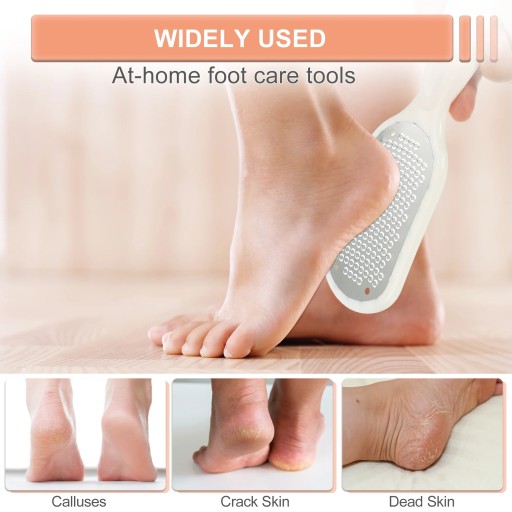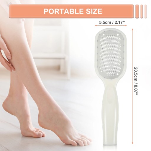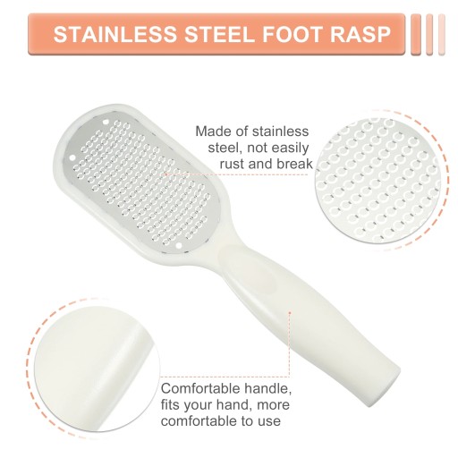 Foot File Foot Rasp Stainless Steel Pedicure File Foot Scraper Callus Remover Tool for Foot Care White Features: Enjoy having soft, smooth feet using foot file. It's ideal for removing stubborn calluses, dry and hardened skin, and cracks on your feet, making your feet smooth and beautiful again. The back has a removable storage cover also protects environment during the process of crushing dead skin. Made of stainless steel, which is sturdy and durable, not easy to rust, washable, and can be used repeatedly. Use Tutorial: 1. To use a foot file, soak your feet in warm soapy water and dry them slightly. 2. File away calluses. Gently move the foot cleaner and callus remover up and down to file away rough skin. Please Note: Due to manual measurement, please allow a small range of error, thank you for your understanding!• Foot File Foot Rasp Stainless Steel Pedicure File Foot Scraper Callus Remover Tool for Foot Care White• Suitable for removing stubborn calluses, dry and hardened skin, and cracks on your feet, making your feet smooth again.• The curved handle design fits the hand and is more comfortable to use.• The foot file is made of stainless steel, which is sturdy and durable, not easy to rust, and can be used repeatedly.• Enjoy having soft, smooth feet using foot file.• Material: ABS, Stainless Steel; Size: 20.5x5.5cm / 8.07"x2.17"(L*W); Color: White; Package List: 1 Pc Foot File.