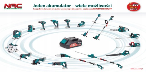 Urządzenie z linii NAC AKUMULTISYSTEM 20V: to linia narzędzi akumulatorowych NAC, które zasilane są tą samą baterią.