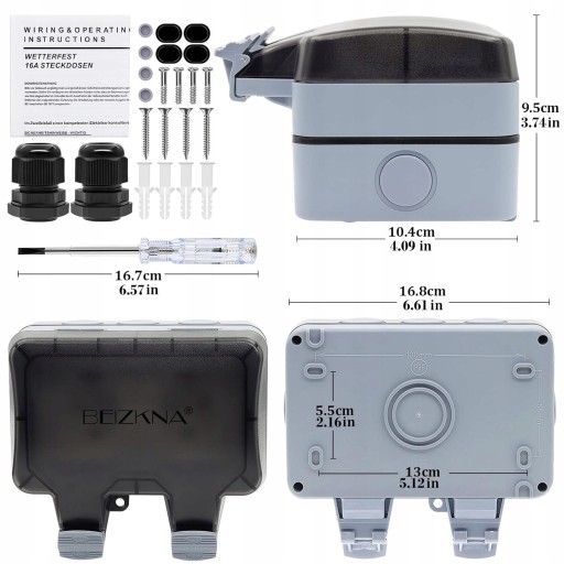 - ✌️Wielofunkcyjne gniazdko zewnętrzne: Odporne na warunki atmosferyczne gniazda są używane na zewnątrz w pralniach, warsztatach, garażach, ogrodach, basenach i zastosowaniach komercyjnych. Stosowane również wewnątrz pomieszczeń w kuchni, pralni, łazience i piwnicy. Kompletne akcesoria: 8 wkrętów, 4 kołki rozporowe, 8 uszczelki gumowe (czarne/szare), 1 śrubokręt, 2 złącza