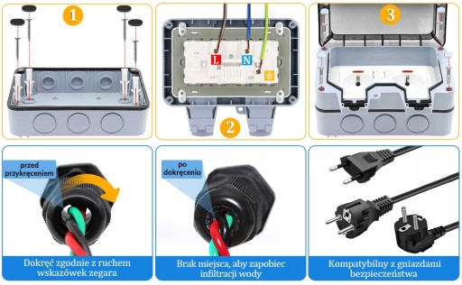 - ✌️Łatwa instalacja: Łatwa instalacja z wyjmowanym wnętrzem. Można otworzyć gniazdo, włożyć kabel do zacisku wtykowego i ponownie go podłączyć. Maksymalne pole przekroju poprzecznego kabla przy wlocie kabla wynosi 2,5 mm². Większa przestrzeń na okablowanie zapewnia miejsce na wszystkie niezbędne kable.