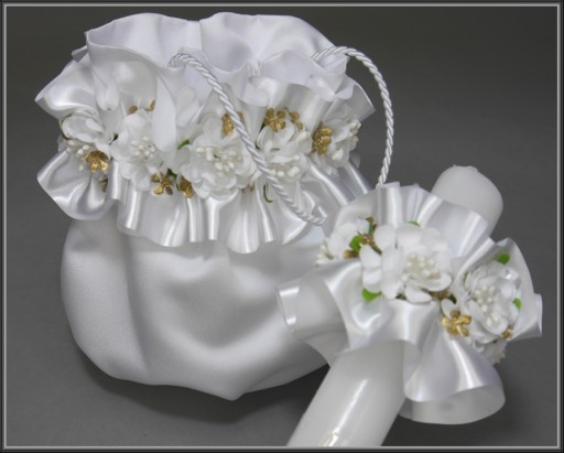 Torebka satynowa w kształcie woreczka z wkładką pomagającą w zachowaniu kształtu woreczka nawet po obciążeniu. Ozdobiona ściąganą satynową kryzą. Woreczek został uszyty z pierwszego gatunku satyny ślubnej. Na pozostałych aukcjach można dopasować profitkę na świecę komunijną.