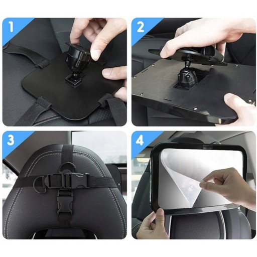 Prezentowane lusterko jest mocowane na zagłówku fotela samochodu, naprzeciwko fotelika dziecka. Jest całkowicie regulowane, aby zapewnić odpowiedni kąt widzenia i umożliwić kierowcy obserwację dziecka z różnych pozycji.