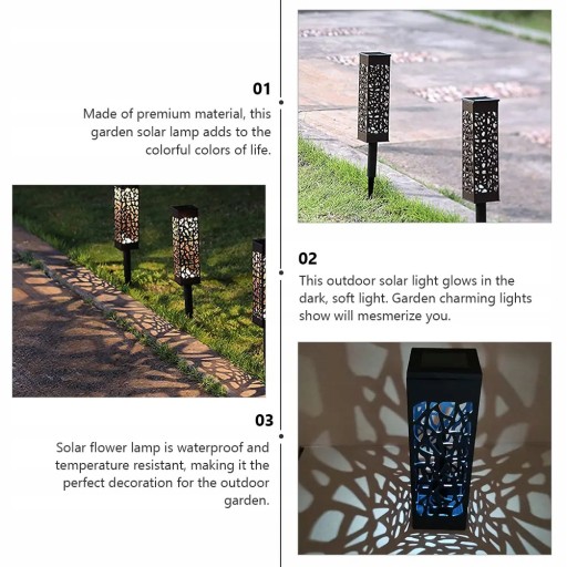 Wykonane z najwyższej jakości materiału i mają dłuższą żywotność. Zewnętrzna lampa solarna, wodoodporna, odporna na wilgoć, rdzę, do oświetlenia ogrodu, dekoracji trawnika, patio, podwórka i wszystkich innych zajęć na świeżym powietrzu, które dzięki pięknemu oświetleniu stworzą wspaniałą i relaksującą atmosferę.