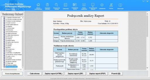 ✅ Automatycznie generuje OCENĘ KOMPLEKSOWĄ organizmu, określającą indywidualne systemy żywieniowe oraz inne zalecenia dla każdego człowieka. Pozwala wielokrotnie kontrolować organizm i porównywać wyniki. Pomiar można wykonywać w każdej chwili, w różnych odstępach czasowych.